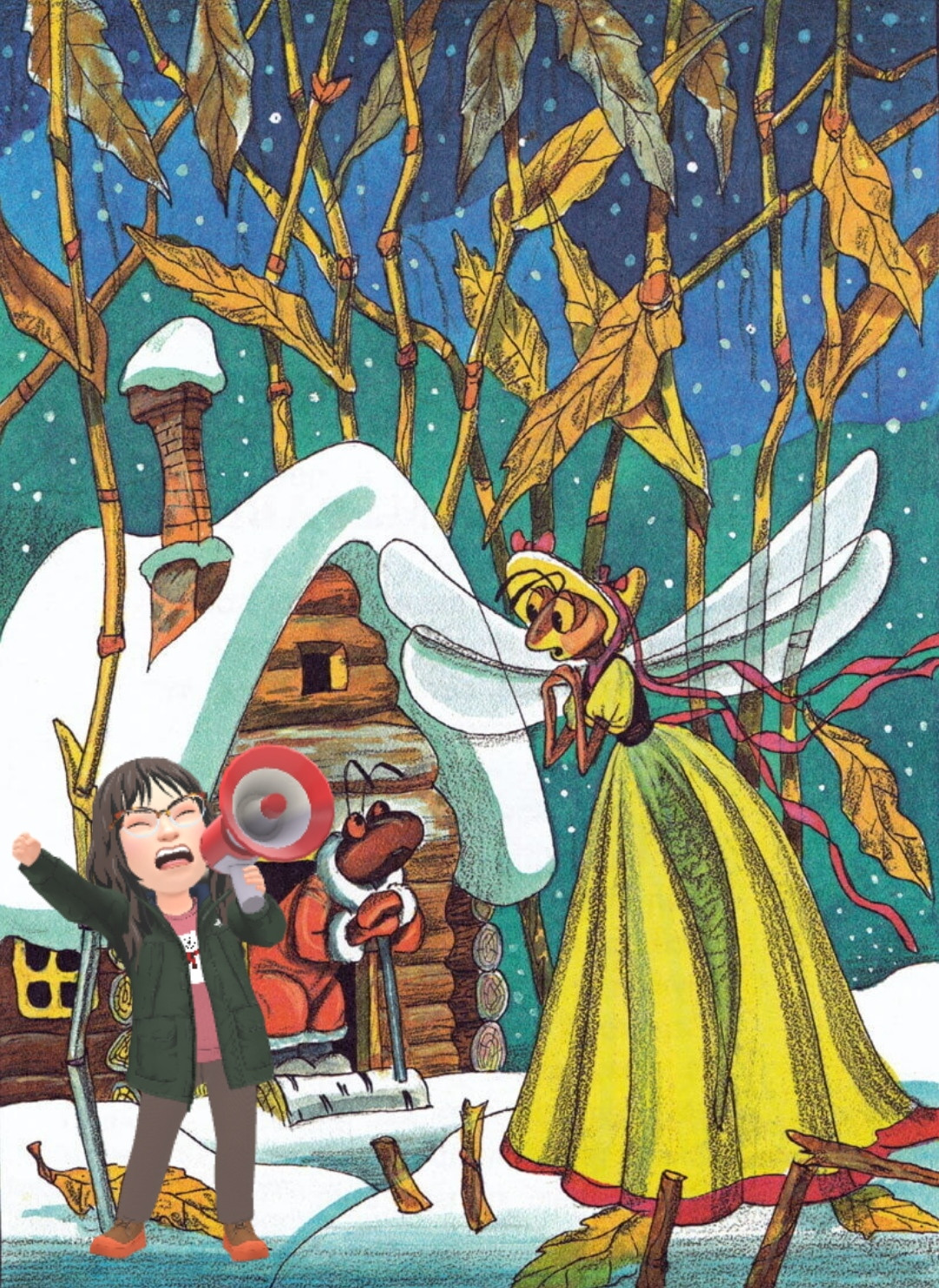 - Так ступай же, попляши. И тут меня прорвало. Дело в том, что стрекоза обратилась к муравью за помощью, а он начал выделываться перед ней. - Надменная букашка!- крикнула я в рупор прямо перед домом того напыщенного муравья,- Бессердечный и бесчувственный! Она жертва, безработицы!