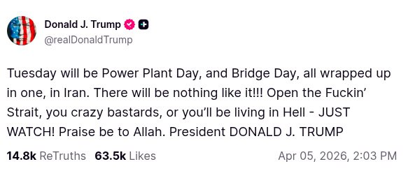 «Во вторник будет День электростанций и День мостов — все сразу, в Иране. Такого вы еще не видели!!! Откройте, блядь, пролив, вы сумасшедшие ублюдки, иначе будете жить в аду — ПРОСТО СМОТРИТЕ! Хвала Аллаху. Президент ДОНАЛЬД ДЖ. ТРАМП»,