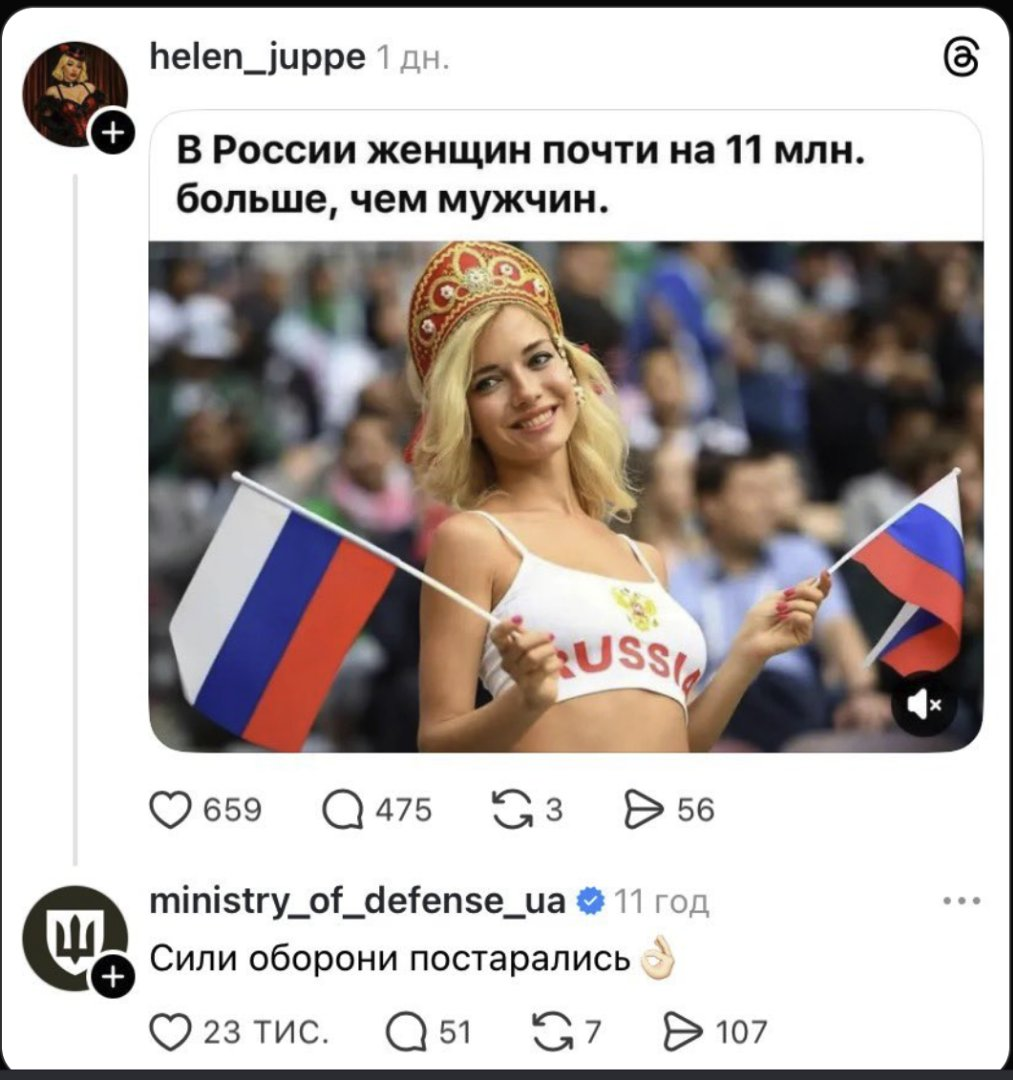Если по делу: это типичный чёрный юмор на стыке демографии и войны. Смысл — в саркастическом «объяснении» гендерного перекоса через потери, отсюда и комментарий.