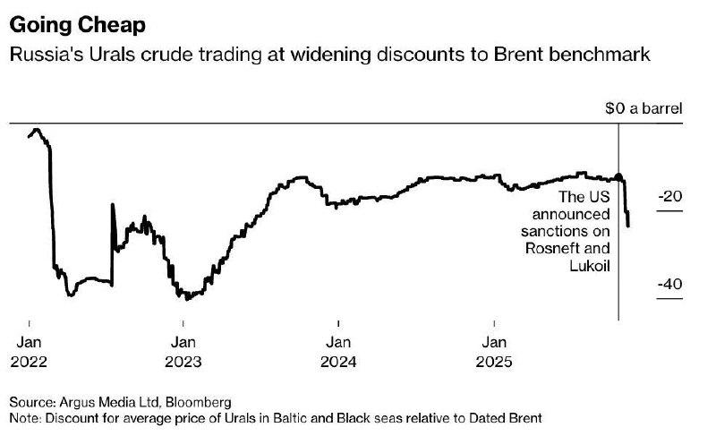 Наразі це найнижчий рівень за 2,5 року. Через санкції проти Роснєфті та Лукойлу, які почнуть діяти 21-го листопада, попит на російську нафту різко впав: китайські, індійські та турецькі НПЗ вже призупиняють закупівлі й шукають альтернативи.