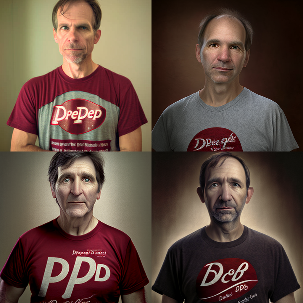 This is what Midjourney v1.4 thinks a "40-year-old man wearing a dr pepper t-shirt" looks like.