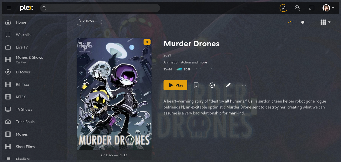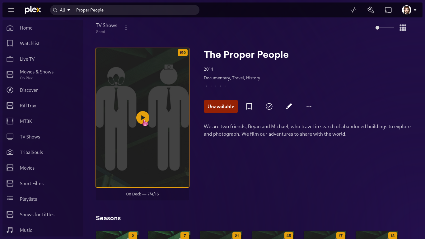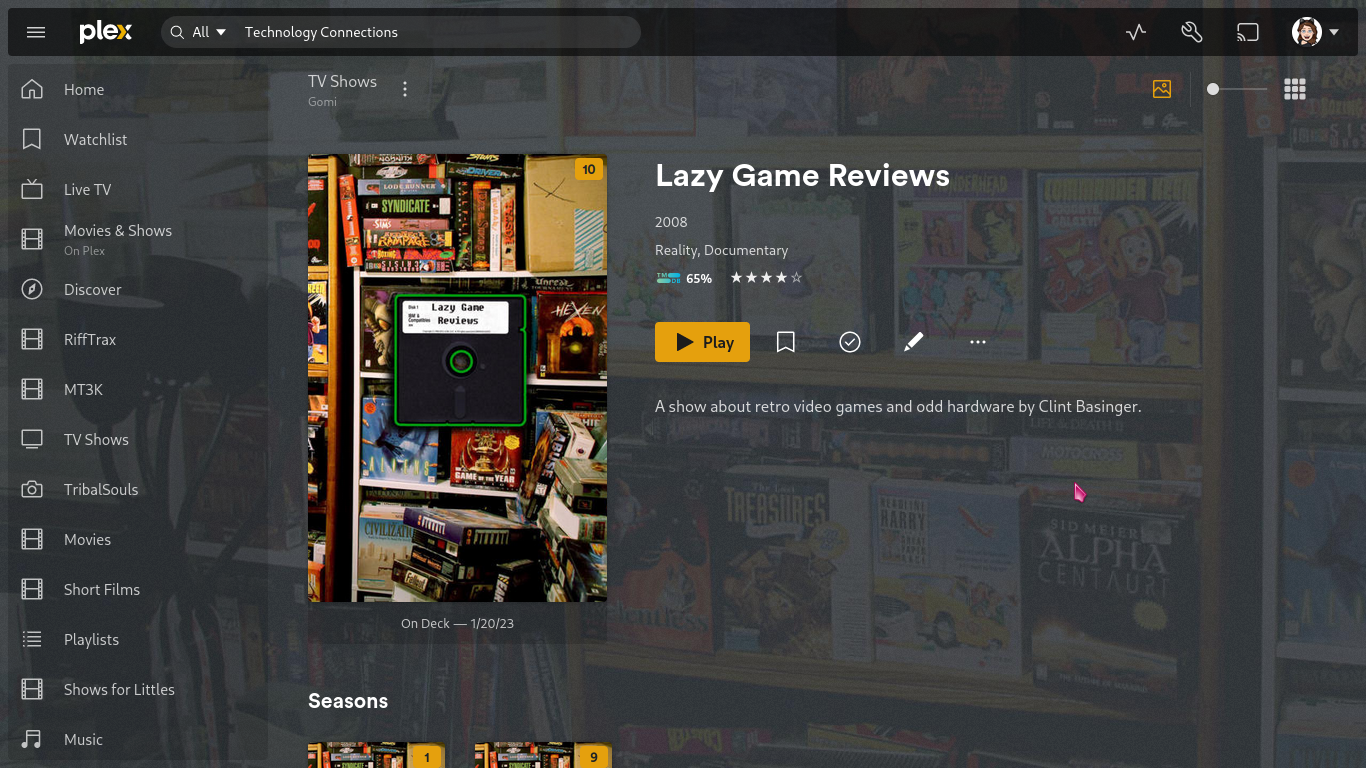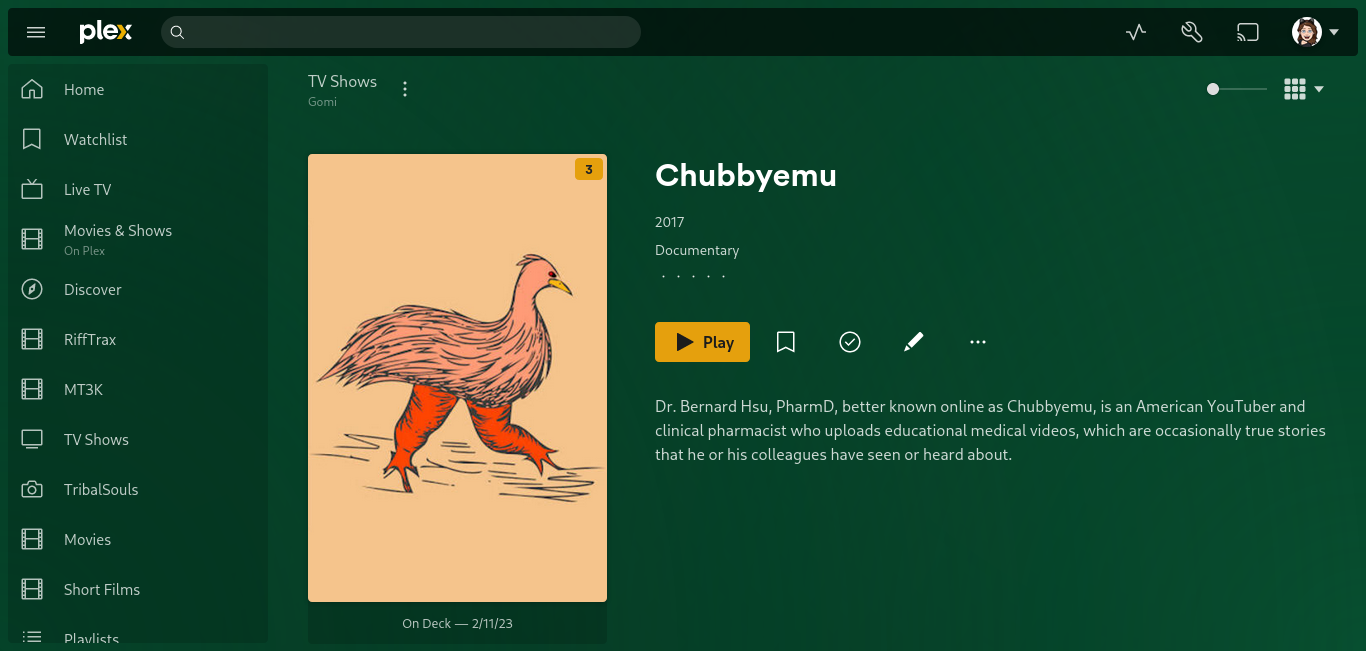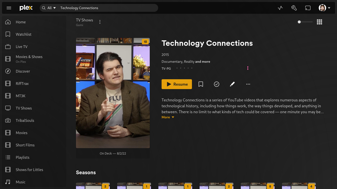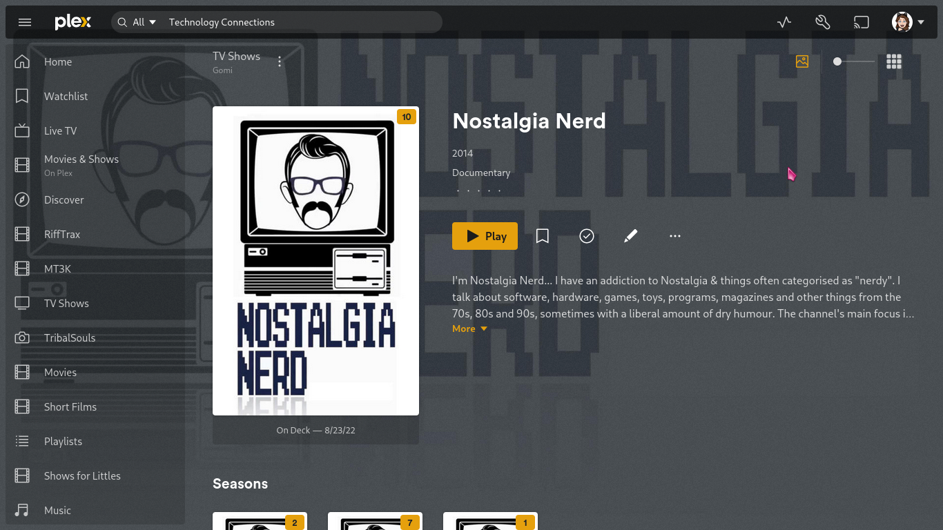 @pwinn And not shown on Plex screenshots - Angry Video Game Nerd,all of the Vsauce channels,FranLab,Big Clive,Lock Picking Lawyer,