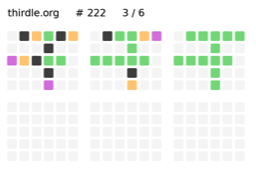 My most recent discovery, thanks to @Spinybadger, is Thirdle. While that game offers a text-only share like the above, and an image+link share, for the sake of mastodon I'm going to post an image.