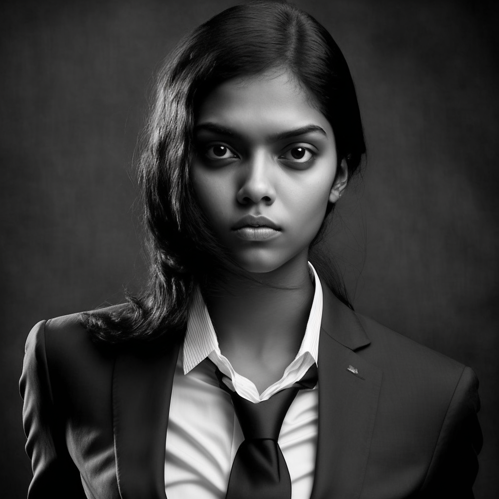 I've had some challenges with MidJourney adding "stuff" to faces, mostly women's faces, and prompting with "clear skin" doesn't always help. Still, this result for "indian girl, suit and tie, photograph, 32K" turned out pretty nicely. It's using the v4 model candidate.
