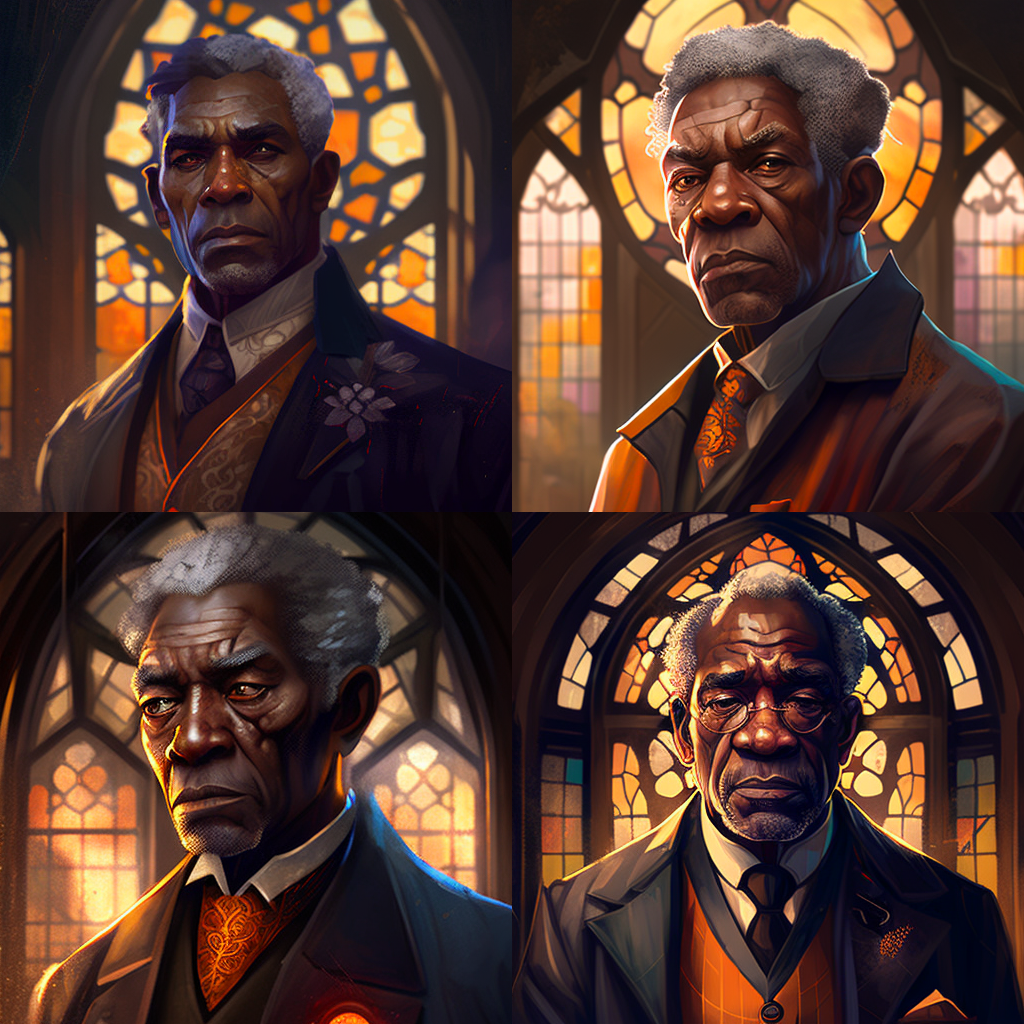 Another pair inspired by @LeviKornelsen, also using a single added phrase: "in front of stained glass." The MidJourney v4 prompt text is mine, based on descriptions Mr. Kornelsen gave his processed images.