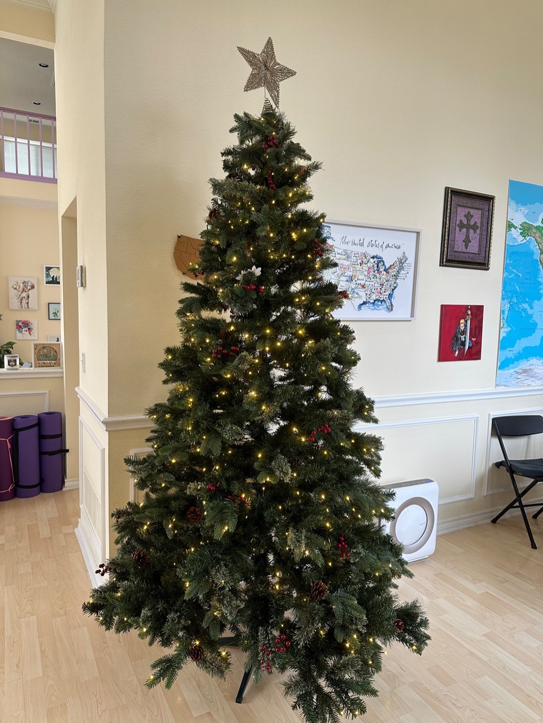 The artificial tree is pre-trimmed with lights and even artificial pine cones and berries, and it looks so good just out of the box that all we've added to it is the traditional star on top. We have traditionally bought one new ornament each every year, and we'll do that again this year, but those will likely be the only four ornaments on the tree, other than the topper.
