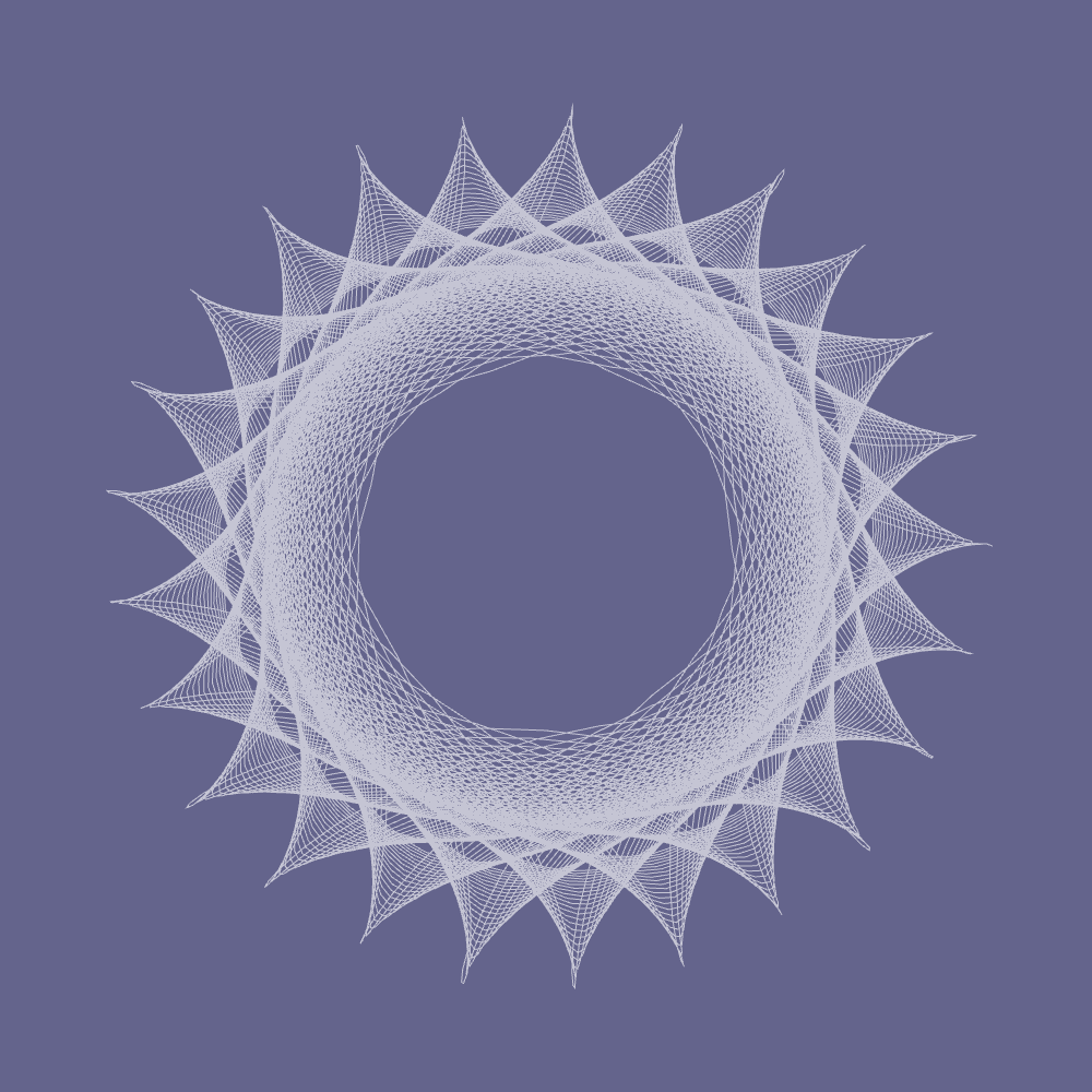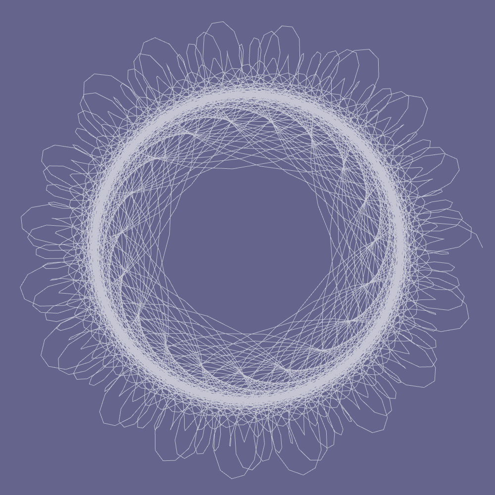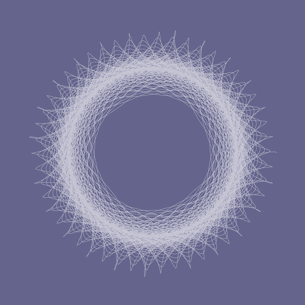 Second, optionally compute those four trig functions using polynomial approximations. This causes the curve to degrade into something a little looser and more interesting than a standard spirograph curve.