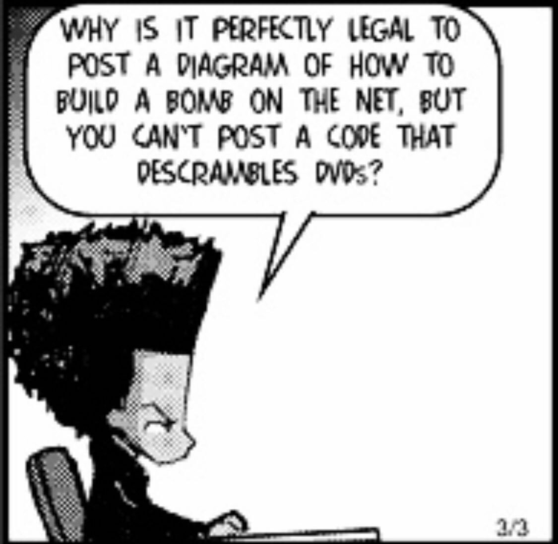 "Why is it perfectly legal to post a diagram of how to buiold a bomb on the net, but you can't post a code that descrambles DVDs?"