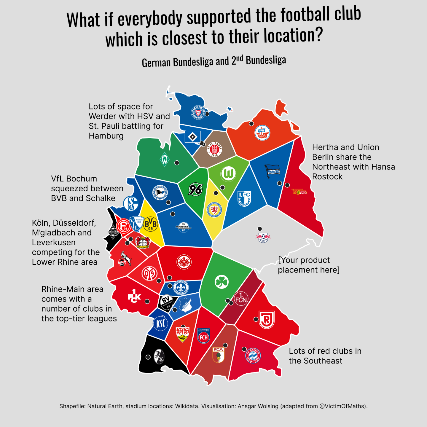 Voronoi polygons show the area where every point is closest to a particular stadium of Bundesliga + 2nd division.