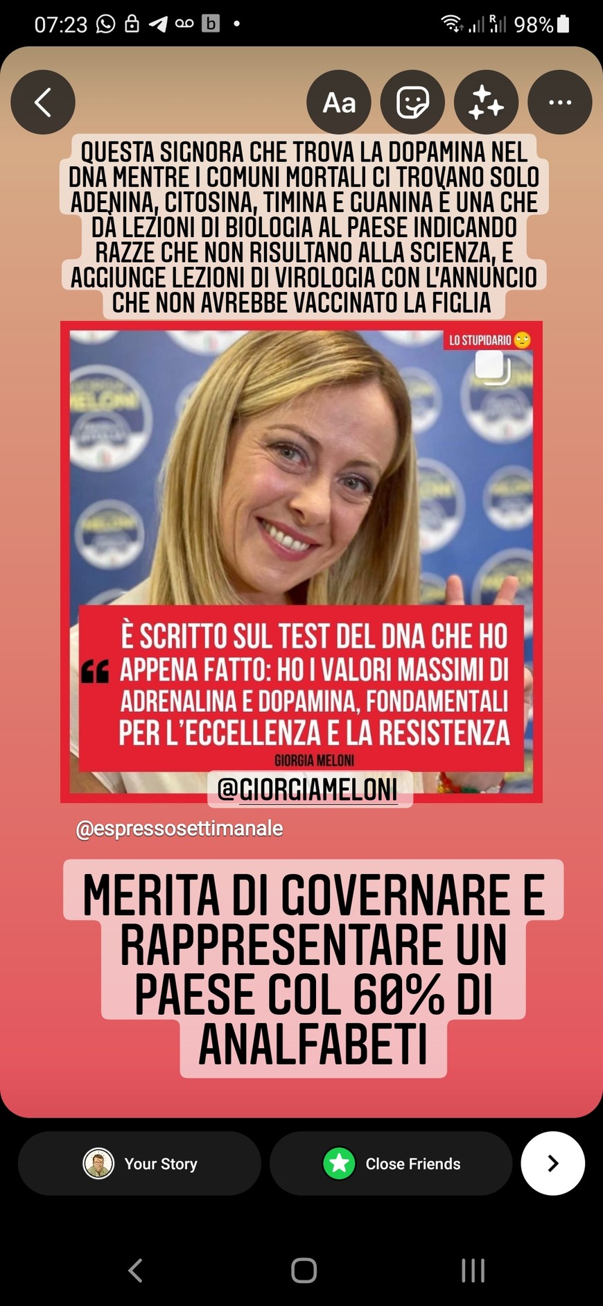 Questa signora che trova la dopamina nel DNA mentre I comuni mortali ci trovano solo adenina, citosina, timina e guanina è una che dà lezioni di biologia al paese indicando razze che non risultano alla scienza, e aggiunge lezioni di virologia con l'annuncio che non avrebbe vaccinato la figlia. Merita di governare e rappresentare un paese col 60% di analfabeti praticanti certificati dall'Istat.