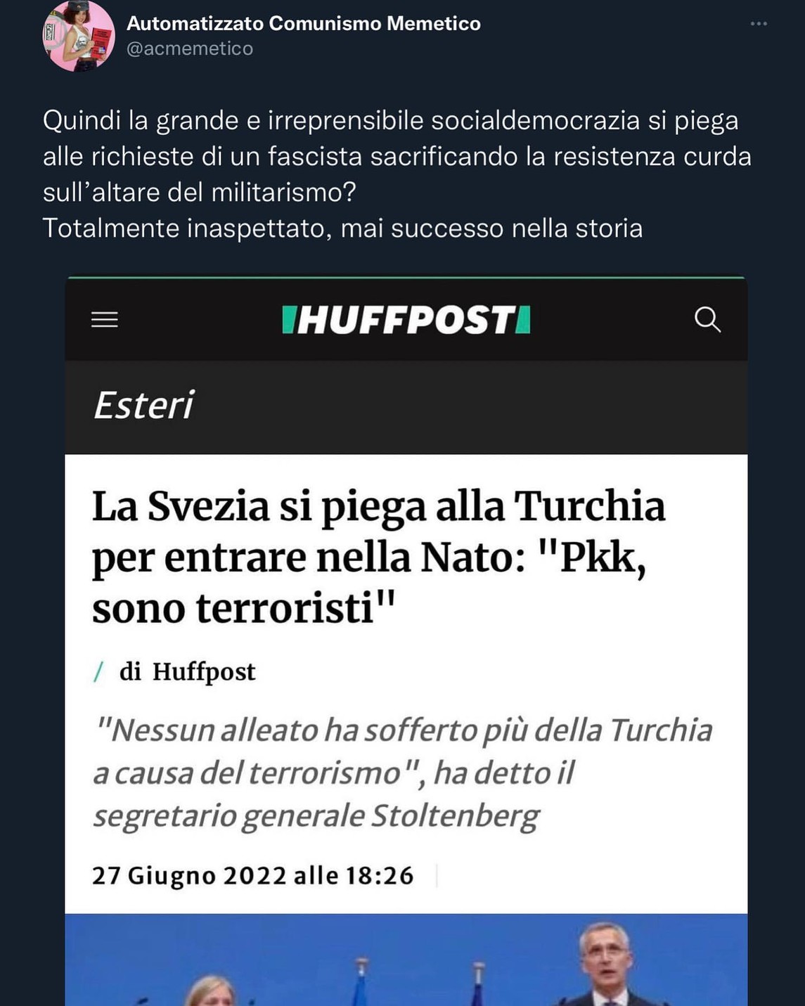 La bilocazione del militarismo NATO: per difenderci in SVEZIA dai russi a cui abbiamo venduto armi italiane bombardiamo curdi in IRAQ con armi italiane. Chissà cosa pensano della resistenza curda quelli che tiravano per la giacchetta anziani partigiani per benedire forniture di armi e folle spesa militare in nome della resistenza ucraina. Se mi chiamate amico di Putin perché sono contro la proliferazione di armi e la spesa militare, ora il vostro militarismo vi rende amici di Erdoğan. #bastaarmi