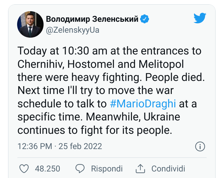 "Oggi alle 10:30 alle entrate di Chernihiv, Hostomel e Melitopol ci sono stati pesanti combattimenti. Sono morte delle persone. La prossima volta cercherò di spostare il programma di guerra per parlare con #MarioDraghi ad un orario preciso. Nel frattempo, l'Ucraina continua a combattere per il suo popolo"