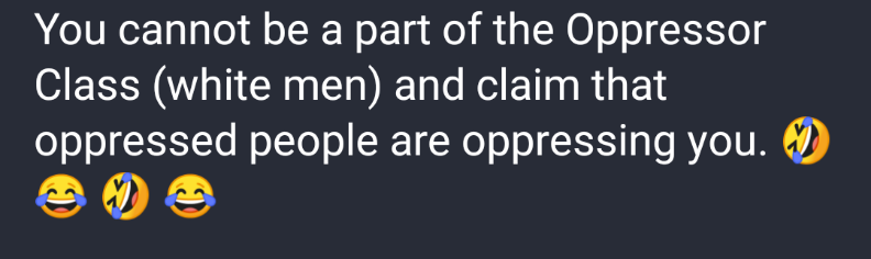 @Locksmith @nothingplanet @SheChanges Yeah, something about racism and sexism against white men counteracting previous racism and sexism perpetrated by white men.