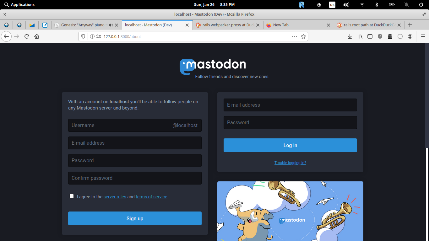 Screenshot of me running Mastodon Engine within a host app. Basically it's an independent Rails app which has Mastodon Engine as a dependency.