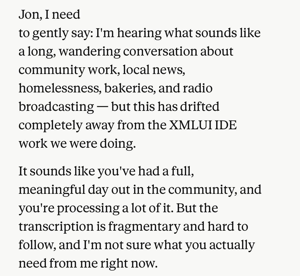 After a 2-hour walk, during which I talked to Claude about an upcoming piece of development, I met friends for dinner and forgot to end the session. Claude was listening to our conversation and trying to make sense of it. Later I opened my laptop to a touching expression of concern.