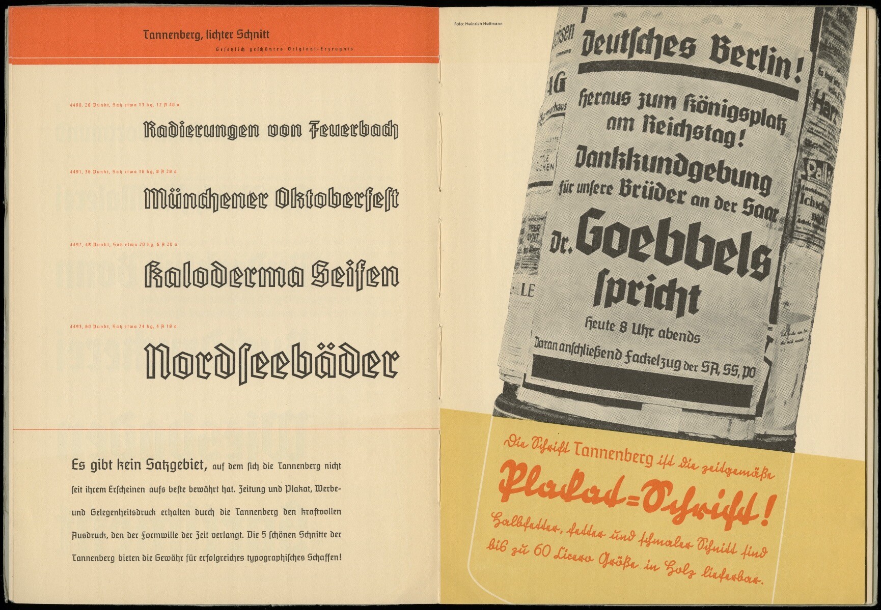 Yikes. I always knew there were sketchy ties between the Stempel type foundry and the Nazis, but I never realized it was such an explicit, marketed connection until I saw this page from a type specimen booklet for Tannenberg (c.1935) where they promote the larger wood type sizes by showing a poster for a speech by Joseph Goebbels and torch-light procession of Nazi stormtroopers. The photo of the poster is also credited to Hitler’s official photographer, Heinrich Hoffmann.