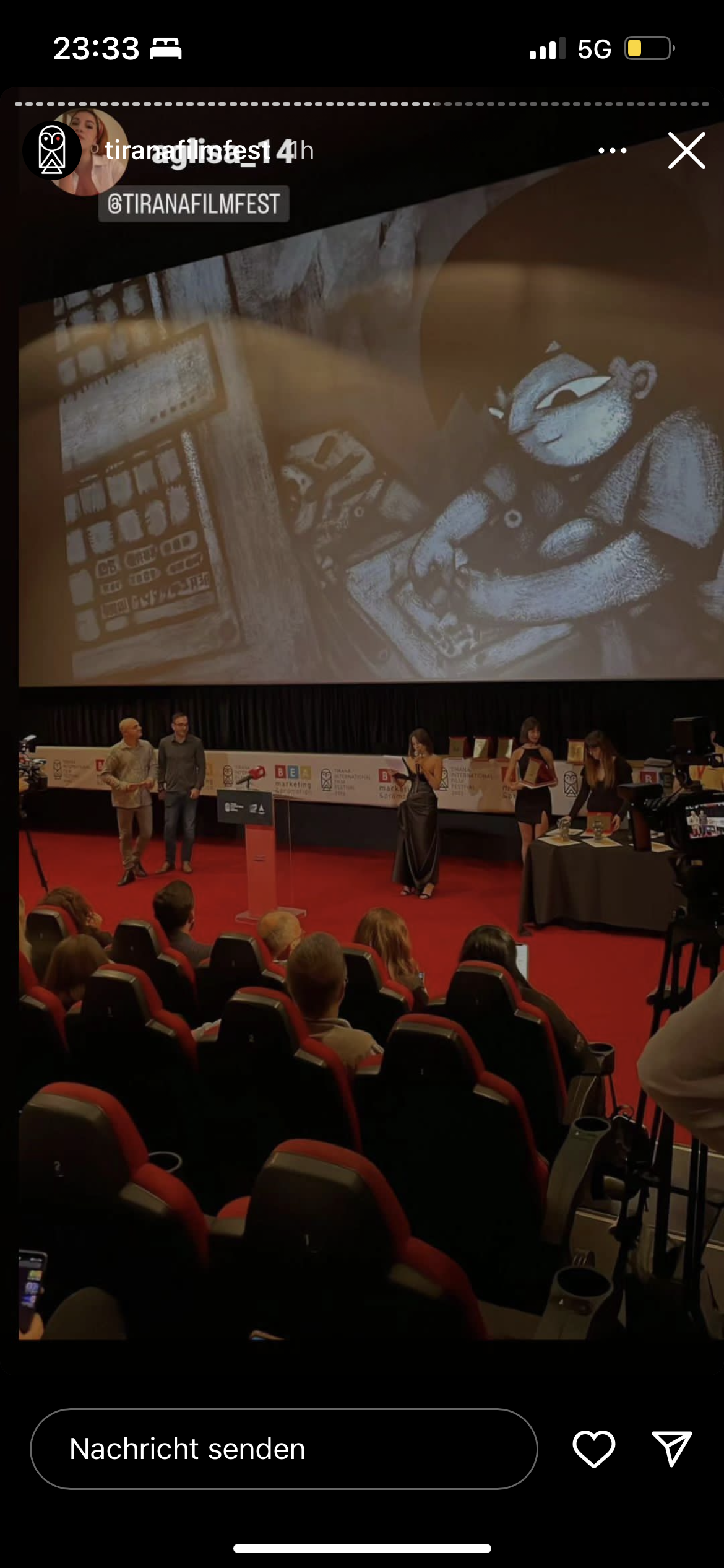 啊啊啊啊一早起来确定得奖了!评委给予奖项的评语是:This film presents a remarkable fusion of imagination and technical prowess, detailing an unconventional bond between avian and human. The film's choice of technique and palette distinctly accentuates its unique narrative, making it a standout in its category. 谢谢电影节和评委们!过去几天在地拉那的经历真是让我感情复杂难以以几句话书写,但无论如何今天我感觉超级幸福 :blobcatmelt: (也很感谢这位我不认识的阿尔巴尼亚女孩帮我拍下了颁奖现场这张照片,这是Dodo拿的第一个奖,对我来说是非常珍贵的回忆呢)