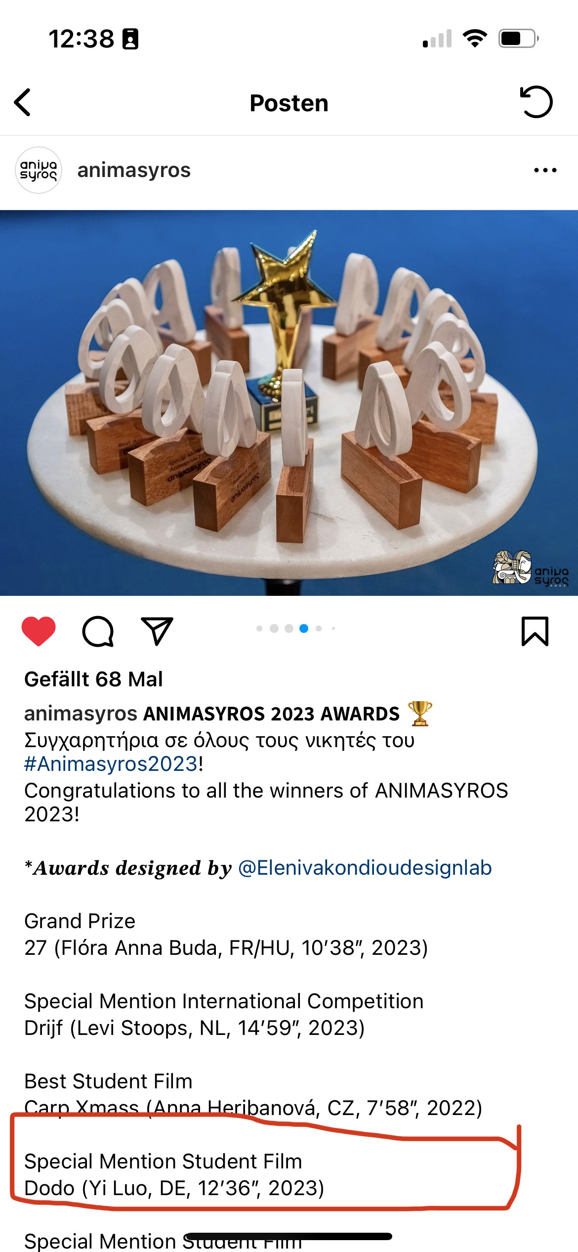 希望以后的奖都能这么接二连三地来 :blobcatmelt: 昨天结束的希腊Animasyros的动画节上,Dodo拿到了第二个奖学生动画单元的特别提及奖!嗷呜! :noii9: