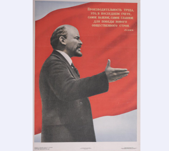 Илл.: "Производительность труда это в последнем счёте, самое важное, самое главное для победы нового общественного строя. Ленин". Советский плакат, 1954 г