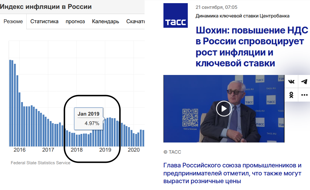 1 января 2019 года ставка НДС была повышена на 2%, до 20 %. Повышение НДС, естественно вызвало рост инфляции, но достаточно умеренный (см. график).