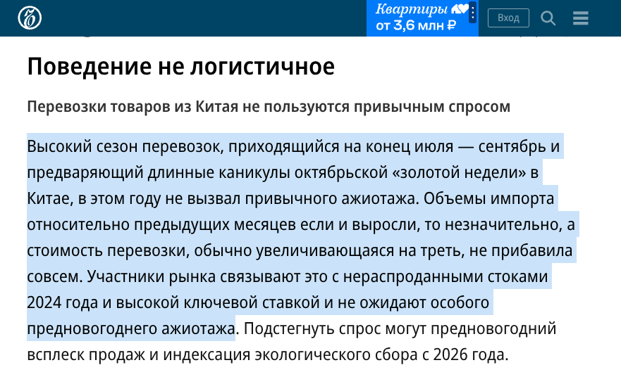 "Высокий сезон перевозок, приходящийся на конец июля — сентябрь и предваряющий длинные каникулы октябрьской «золотой недели» в Китае, в этом году не вызвал привычного ажиотажа.