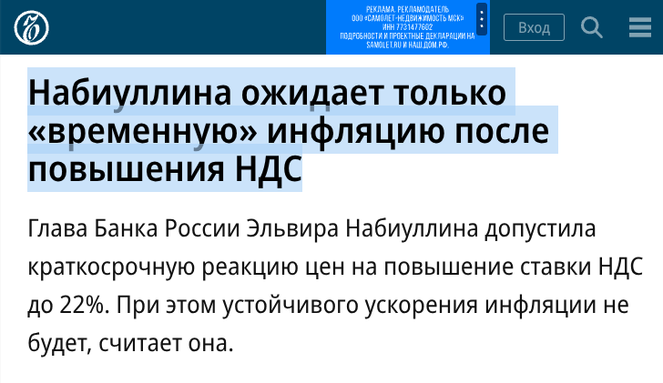 "Набиуллина ожидает только «временную» инфляцию после повышения НДС".
