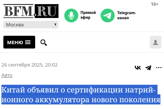 Характеристики впечатляют: аккумулятор заряжается до 80% за 15 минут, работает при температуре от минус 40 до плюс 70 градусов, отличается высокой безопасностью, тянет до 500 километров, а самое главное — стоит в десять раз дешевле, чем литиевые аналоги".