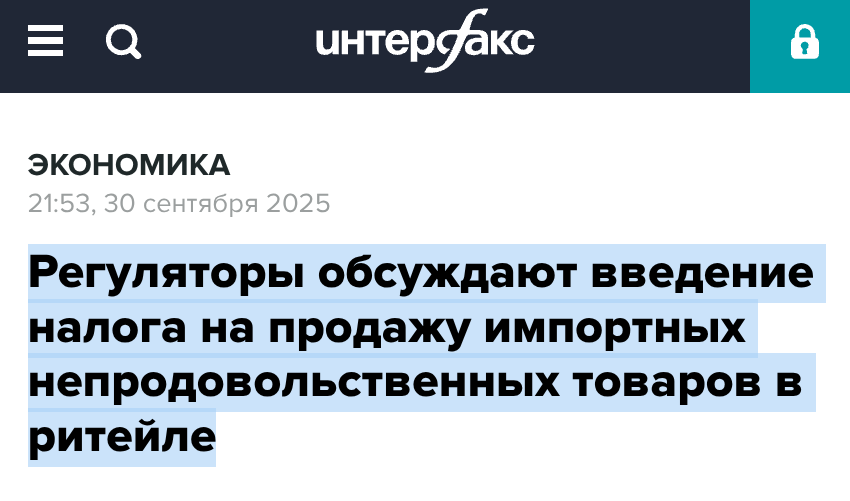 "Регуляторы обсуждают введение налога на продажу импортных непродовольственных товаров в ритейле".