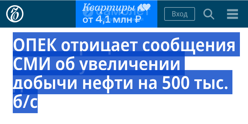 "ОПЕК отрицает сообщения СМИ об увеличении добычи нефти на 500 тыс. б/с.