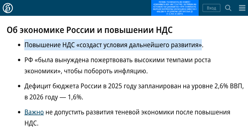 "Повышение НДС «создаст условия дальнейшего развития»".