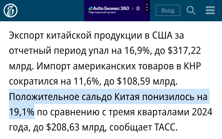 "Экспорт китайской продукции в США за отчетный период упал на 16,9%, до $317,22 млрд. Импорт американских товаров в КНР сократился на 11,6%, до $108,59 млрд.