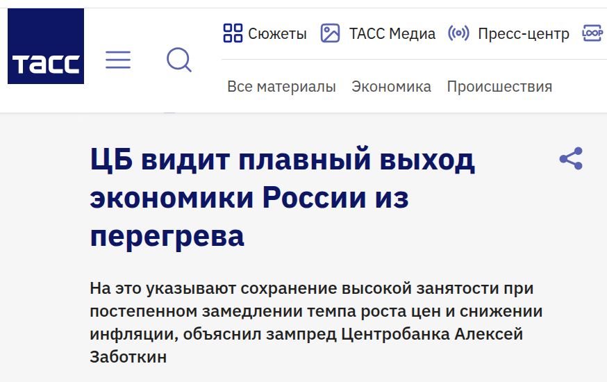"Сохранение высокой занятости при постепенном замедлении темпа роста цен и снижении инфляции позволяют утверждать, что реализуется сценарий плавного выхода из перегрева прошлого года, и ситуация развивается в целом в русле нашего макроэкономического прогноза на этот год", - сказал он".