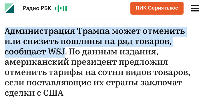 "Администрация Трампа может отменить или снизить пошлины на ряд товаров, сообщает WSJ.