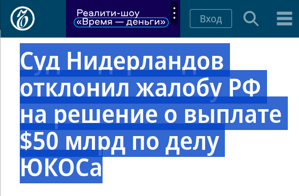 "Суд Нидерландов отклонил жалобу РФ на решение о выплате $50 млрд по делу ЮКОСа".