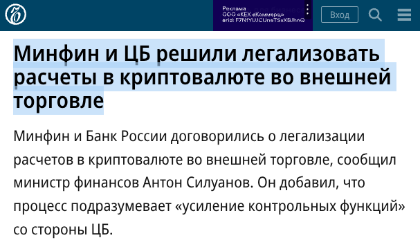 "Минфин и ЦБ решили легализовать расчеты в криптовалюте во внешней торговле".