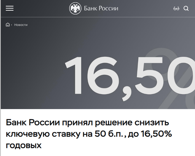 "Банк России принял решение снизить ключевую ставку на 50 б.п., до 16,50% годовых".