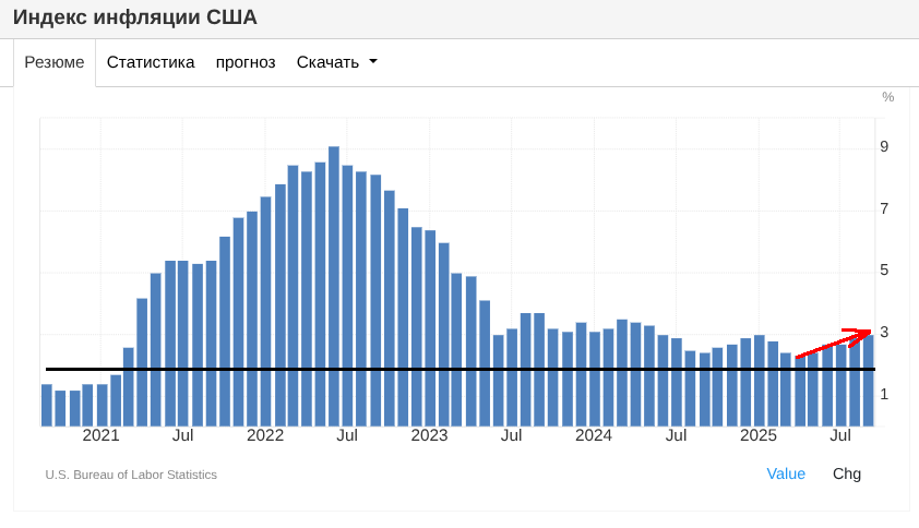 Инфляция в США - 3% - заметно выше таргета (целевого уровня 2%). Кроме того, последние 6 мес. - явно имеет тенденцию к росту.