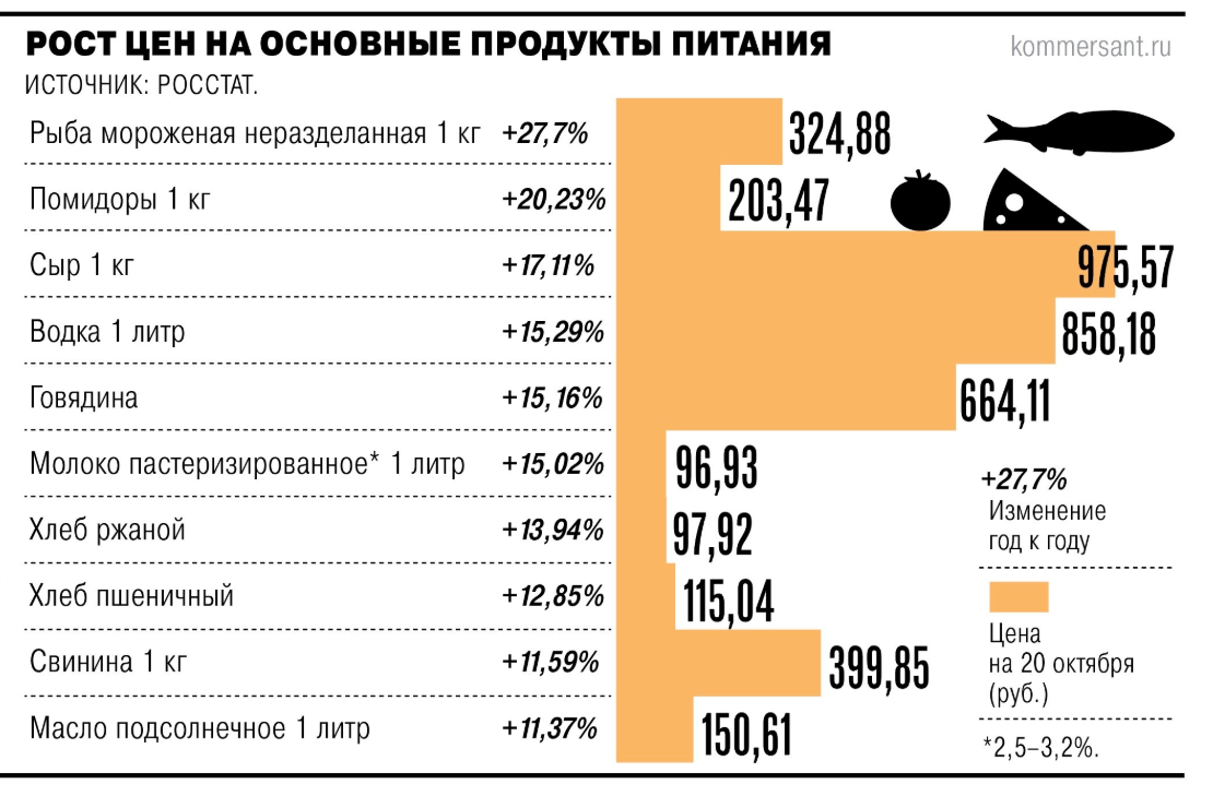"Согласно «Такском» (оператор фискальных данных), в сентябре—октябре продажи основных продуктов питания в натуральном выражении опустились на 5% год к году.