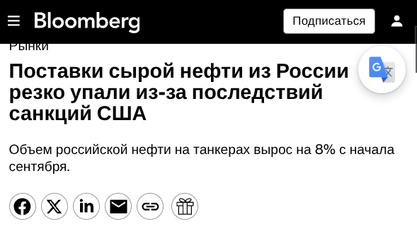 "Российская нефть столкнулась с самым резким ростом дисконтов за последний год — скидки на Urals в портах на Балтике и Черном море достигли почти $20 за баррель".