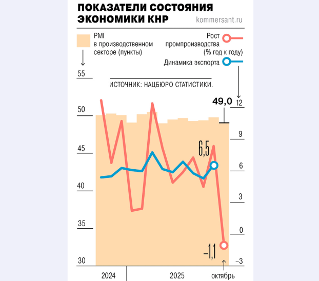 "Китайский экспорт в октябре сократился на 1,1% год к году, до $305,4 млрд — это минимум за восемь месяцев, следует из данных Главного таможенного управления (ГТУ) страны".