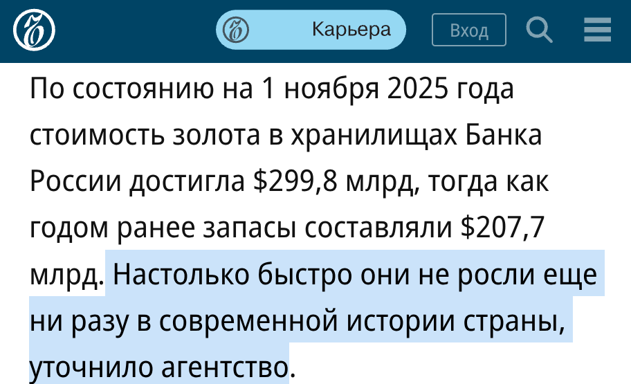 "По состоянию на 1 ноября 2025 года стоимость золота в хранилищах Банка России достигла $299,8 млрд, тогда как годом ранее запасы составляли $207,7 млрд.