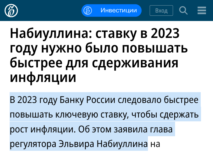 "В 2023 году Банку России следовало быстрее повышать ключевую ставку, чтобы сдержать рост инфляции. Об этом заявила глава регулятора Эльвира Набиуллина на пленарном заседании конгресса финансистов в Казахстане.