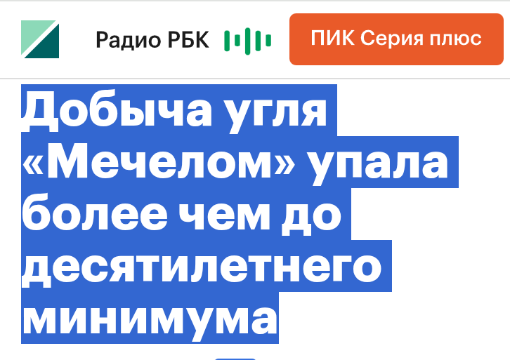 "Добыча угля «Мечелом» упала более чем до десятилетнего минимума".