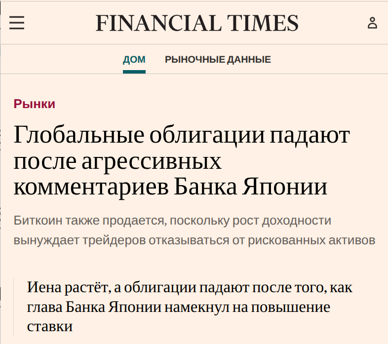 "Иена растёт, а облигации падают после того, как глава Банка Японии намекнул на повышение ставки".