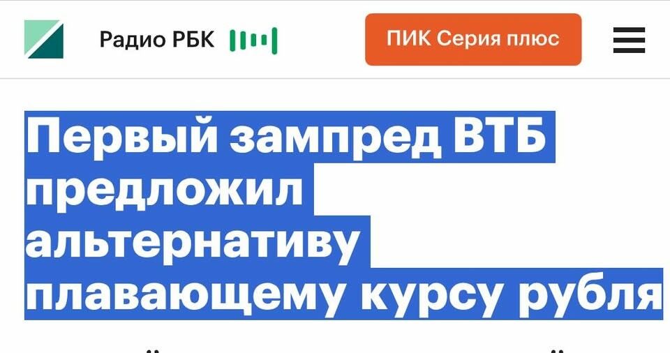 "Первый зампред ВТБ Дмитрий Пьянов предложил заменить механизм плавающего валютного курса рубля.