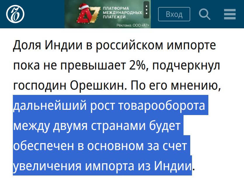 "По словам Максима Орешкина, три года назад объем торговли между Россией и Индией достиг $30 млрд. С 2022-го по 2024 год темпы роста составляли 80% в год. Теперь показатель движется к $70 млрд. Цель — достичь уровня $100 млрд к 2030 году.