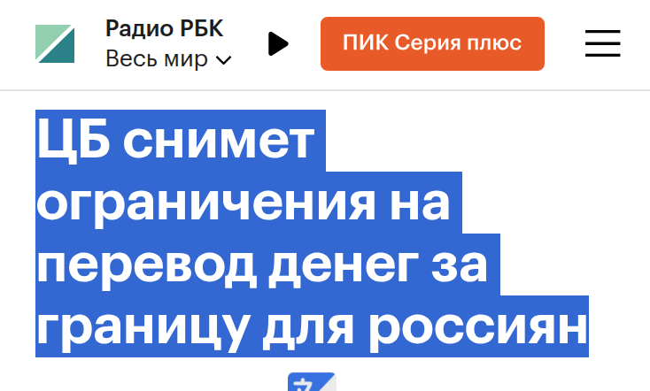 "С 8 декабря ограничения на перевод денег за границу для россиян и граждан дружественных стран будет снят. Об этом сообщил ЦБ".