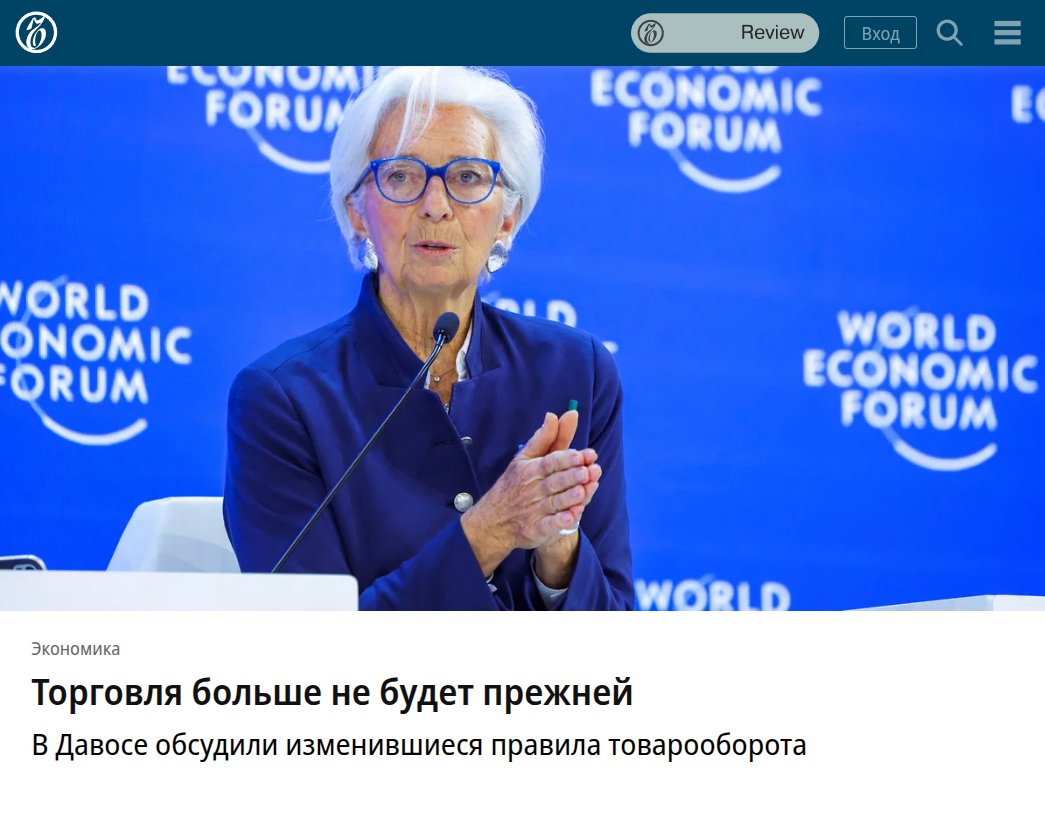 "Произошедшее изменение правил игры в мировой торговле больше не воспринимается ее участниками и экспертами как временное, показали дискуссии на Всемирном экономическом форуме (ВЭФ) в швейцарском Давосе".