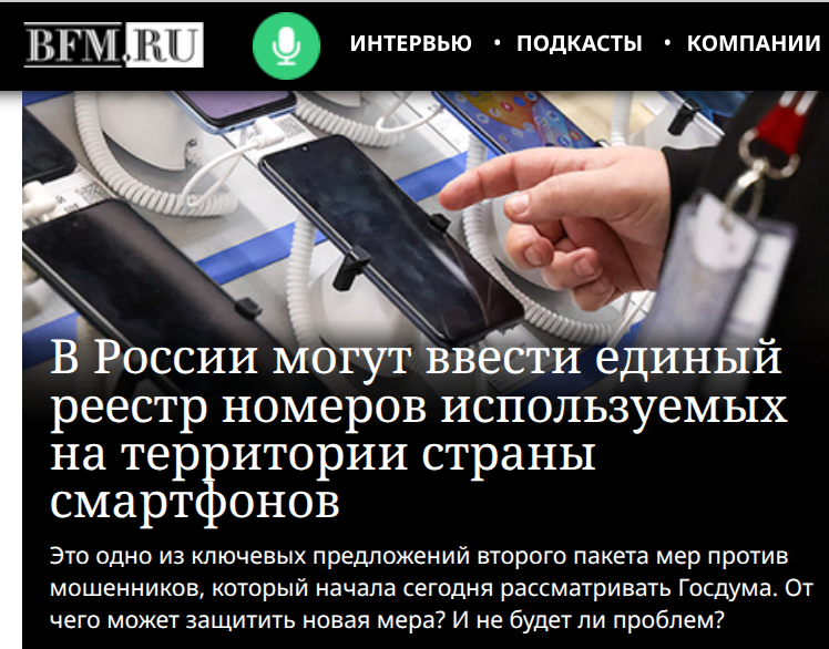 "Сегодня Госдума в первом чтении рассмотрит пакет мер по противодействию мошенникам. Одна из самых важных — создание единой базы уникальных номеров мобильных устройств IMEI.