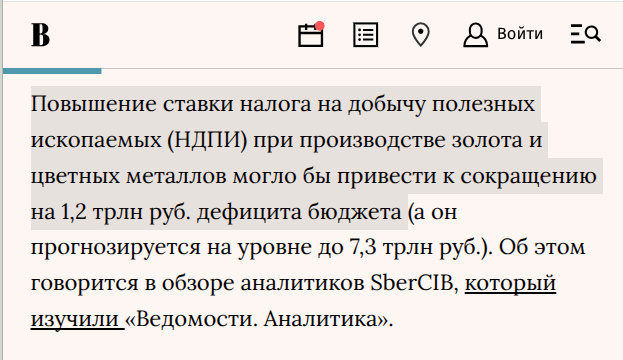 "Повышение ставки налога на добычу полезных ископаемых (НДПИ) при производстве золота и цветных металлов могло бы привести к сокращению на 1,2 трлн руб. дефицита бюджета (а он прогнозируется на уровне до 7,3 трлн руб.)".